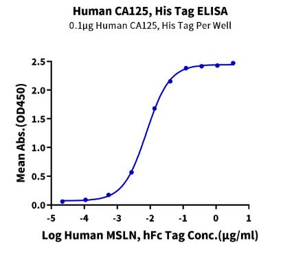 | Bio-activity : | Immobilized Human CA125, His Tag at 1μg/ml (100μl/well) on the plate. Dose response curve for Human MSLN, hFc Tag with the EC50 of 7.8ng/ml determined by ELISA. |