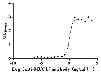 Measured by its binding ability in a functional ELISA. Immobilized Human MUC17 at 2 μg/mL can bind Anti-MUC17 recombinant antibody, the EC50 is 0.9057-1.259 ng/mL. |