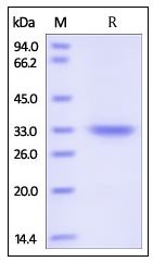 | Molecular Mass : | The protein has a calculated MW of 32 kDa. The protein migrates as 33 kDa under reducing (R) condition (SDS-PAGE) due to most of the MYOC was cleaved at Glu 214, generating a C-terminal fragment. |