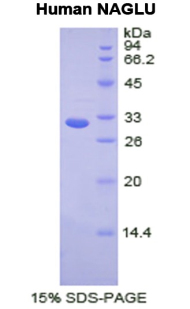 This gene encodes an enzyme that degrades heparan sulfate by hydrolysis of terminal N-acetyl-D-glucosamine residues in N-acetyl-alpha-D-glucosaminides. Defects in this gene are the cause of mucopolysaccharidosis type IIIB (MPS-IIIB), also known as Sanfilippo syndrome B. This disease is characterized by the lysosomal accumulation and urinary excretion of heparan sulfate. |
