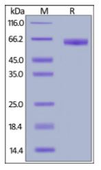 | Molecular Mass : | The protein has a calculated MW of 53.0 kDa. The protein migrates as 60-66 kDa under reducing (R) condition (SDS-PAGE) due to glycosylation. |