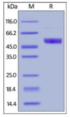 Molecular Mass : | The protein has a calculated MW of 39.5 kDa. The protein migrates as 50-58 kDa under reducing (R) condition (SDS-PAGE) due to glycosylation. |
