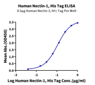 | Bio-activity : | Immobilized Human Nectin-3, hFc Tag at 5μg/ml (100μl/well) on the plate. Dose response curve for Human Nectin-1, His Tag with the EC50 of 0.11μg/ml determined by ELISA. |