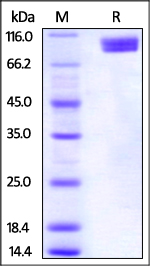 Human Nectin-3, Fc Tag is fused with a human IgG1 Fc tag at the C-terminus, and has a calculated MW of 64.3 kDa. The reducing (R) protein migrates as 80-100 kDa in SDS-PAGE due to glycosylation. |