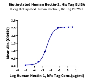 | Bio-activity : | Immobilized Biotinylated Human Nectin-3, His Tag at 2ug/ml (100ul/well) on the streptavidin precoated plate (5ug/ml). Dose response curve for Human Nectin-1, hFc Tag with the EC50 of 3.2ng/ml determined by ELISA (QC Test). |