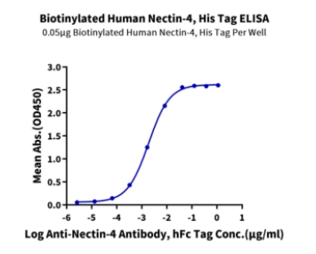 Immobilized Biotinylated Human Nectin-4, His Tag at 0.5μg/ml (100μl/well) on the streptavidin precoated plate (5μg/ml). Dose response curve for Anti-Nectin-4 Antibody, hFc Tag with the EC50 of 1.9ng/ml determined by ELISA. |