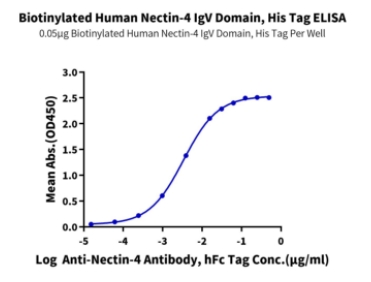 | Bio-activity : | Immobilized Biotinylated Human Nectin-4 IgV Domain, His Tag at 0.5ug/ml (100ul/well) on the streptavidin precoated plate (5ug/ml). Dose response curve for Anti-Nectin-4 Antibody, hFc Tag with the EC50 of 3.4ng/ml determined by ELISA. |