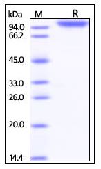 | Molecular Mass : | The protein has a calculated MW of 74.4 kDa. The protein migrates as 100-116 kDa under reducing (R) condition (SDS-PAGE) due to glycosylation. |