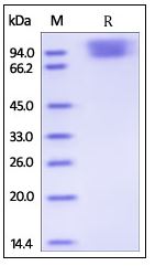 | Molecular Mass : | The protein has a calculated MW of 72.2 kDa. The protein migrates as 80-110 kDa under reducing (R) condition (SDS-PAGE) due to glycosylation. |