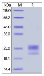 | Molecular Mass : | The protein has a calculated MW of 16.5 kDa. The protein migrates as 21 kDa and 24-27 kDa under reducing (R) condition (SDS-PAGE) due to glycosylation. |