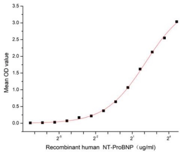 Terminal pro-brain natriuretic peptide (NT-proBNP) is a prohormone with a 76 amino acid N-terminal inactive protein that is cleaved from the molecule to release brain natriuretic peptide (BNP)1. NT-proBNP may affect cardio-renal homeostasis and it can oduction of cGMP although its potency is very low compared to brain natriuretic peptide 32. C Reactive Protein (CRP) can interact with NT-proBNP, thus a functional binding ELISA assay was conducted to detect the interaction of recombinant human NT-proBNP and recombinant human CRP. Briefly, NT-proBNP was diluted serially in PBS with 0.01% BSA (pH 7.4). Duplicate samples of 100 μl were then transferred to CRP-coated microtiter wells and incubated for 1h at 37°C. Wells were washed with PBST and incubated for 1h with anti-NT-proBNP pAb, then aspirated and washed 3 times. After incubation with HRP labelled secondary antibody for 1h at 37°C, wells were aspirated and washed 5 times. With the addition of substrate solution, wells were incubated 15-25 minutes at 37°C. Finally, add 50 µL stop solution to the wells and read at 450/630 nm immediately. The binding activity of recombinant human NT-proBNP and recombinant human CRP was shown, the EC50 for this effect is 4.2 ug/mL. |