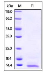| Molecular Mass : | This protein carries a polyhistidine tag at the C-terminus.The protein has a calculated MW of 8.6 kDa. The protein migrates as 13 kDa under reducing (R) condition (SDS-PAGE) due to glycosylation. |