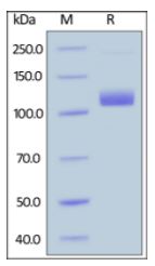 Molecular Mass : | The protein has a calculated MW of 96.5 kDa. The protein migrates as 105-130 kDa under reducing (R) condition (SDS-PAGE) due to glycosylation. |