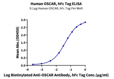 | Bio-activity : | Immobilized Human OSCAR, hFc Tag at 1ug/ml (100ul/Well) on the plate. Dose response curve for Biotinylated Anti-OSCAR Antibody, hFc Tag with the EC50 42.0ng/ml determined by ELISA. |