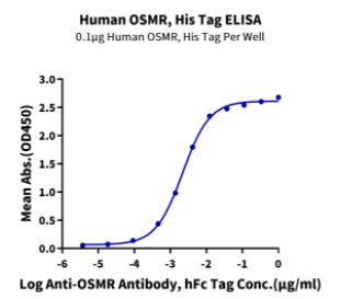 | Bio-activity : | Immobilized Human OSMR, His Tag at 1ug/ml (100ul/Well) on the plate. Dose response curve for Anti-OSMR Antibody, hFc Tag with the EC50 of 2.2ng/ml determined by ELISA. |