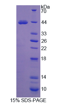 43kDa as determined by SDS-PAGE reducing conditions. |