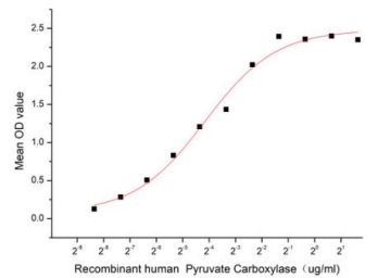 | Bio-activity : | Pyruvate carboxylase (PC) is a mitochondrial, biotin-containing enzyme catalyzing the ATP-dependent synthesis of oxaloacetate from pyruvate and bicarbonate, with a critical anaplerotic role in sustaining the brain metabolism. Pyruvate carboxylase (PC) deficiency is a rare autosomal recessive mitochondrial neurometabolic disorder of energy deficit resulting in high morbidity and mortality, with limited therapeutic options. Besides, PCK2 has been identified as an interactor of PC, thus a functional binding ELISA assay was conducted to detect the interaction of recombinant human PC and recombinant human PCK2. Briefly, biotin-linked PC were diluted serially in PBS, with 0.01% BSA (pH 7.4). Duplicate samples of 100 ul were then transferred to PCK2-coated microtiter wells and incubated for 1h at 37°C. Wells were washed with PBST 3 times and incubation with Streptavidin-HRP for 30 min, then wells were aspirated and washed 5 times. With the addition of substrate solution, wells were incubated 15-25 minutes at 37°C. Finally, add 50 µl stop solution to the wells and read at 450 nm immediately. The binding activity of PC and PCK2 was shown, the EC50 for this effect is 0.056 ug/mL. |