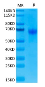 | Molecular Mass : | The protein has a predicted MW of 42.6 kDa. Due to glycosylation, the protein migrates to 65-72 kDa based on Tris-Bis PAGE result. |