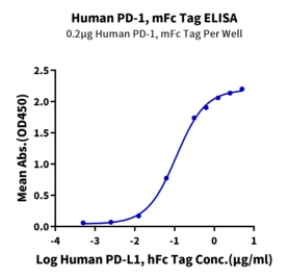 | Bio-activity : | Immobilized Human PD-1, mFc Tag at 2μg/ml (100μl/well) on the plate. Dose response curve for Human PD-L1, hFc Tag with the EC50 of 0.11μg/ml determined by ELISA. |