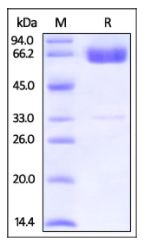 Molecular Mass : | The protein has a calculated MW of 49.2 kDa. The protein migrates as 60-70 kDa under reducing (R) condition (SDS-PAGE) due to glycosylation. |