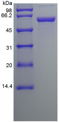 | Molecular Mass : | Approximately 56.6 kDa, a single non-glycosylated polypeptide chain containing 502 amino acids. (MRGSGSHHHHHH-PDI). |
