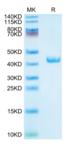 Molecular Mass : | The protein has a predicted MW of 34.5 kDa. Due to glycosylation, the protein migrates to 40-50 kDa based on Tris-Bis PAGE result. |