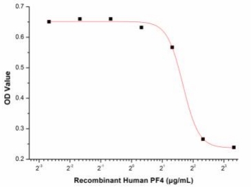 Platelet factor 4 (PF4) is a small cytokine belonging to the CXC chemokine family that is also known as chemokine (C-X-C motif) ligand 4 (CXCL4). This chemokine is released from alpha-granules of activated platelets during platelet aggregation, and promotes blood coagulation by moderating the effects of heparin-like molecules. Due to these roles, it is predicted to play a role in wound repair and inflammation. It was reported that PF4 can inhibits U937 cells proliferation. To test the effect of U937 on cell apoptosis, U937 cells were seeded into 96-well plates at a density of 5,000 cells/well with 5% serum standard 1640 including various concentrations of recombinant Human PF4. After incubated for 48 h, cells were observed by inverted microscope and cell proliferation was measured by Cell Counting Kit-8 (CCK-8). Briefly, 10 µL of CCK-8 solution was added to each well of the plate, then the absorbance at 450 nm was measured using a microplate reader after incubating the plate for 4 hours at 37°C. Proliferation of U937 cells after incubation with PF4 for 48 h observed by inverted microscope was shown. Cell viability was assessed by CCK-8 assay after incubation with recombinant Human PF4 for 48 h. It was obvious that PF4 significantly inhibit cell viability of U937 cells. The ED50 is 2.2-3.1μg/mL. |