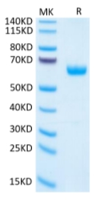 Molecular Mass : | The protein has a predicted MW of 48.6 kDa. Due to glycosylation, the protein migrates to 60-70 kDa based on Tris-Bis PAGE result. |