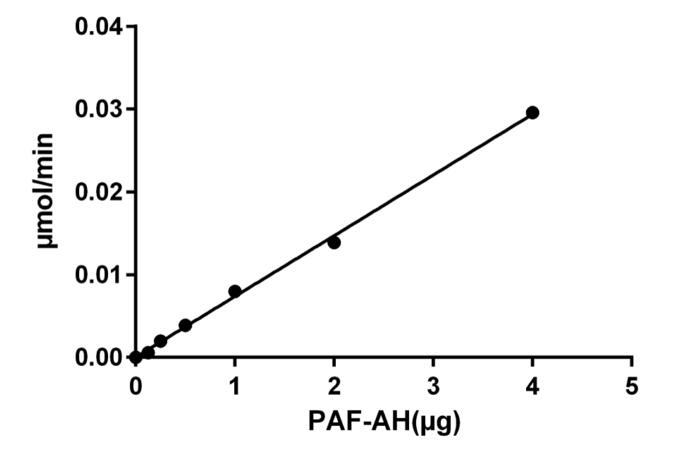 | Product Overview : | Active recombinant N-terminal hexahistidine-tagged full length human PLA2G7 protein (42-441) was expressed in E. coli |