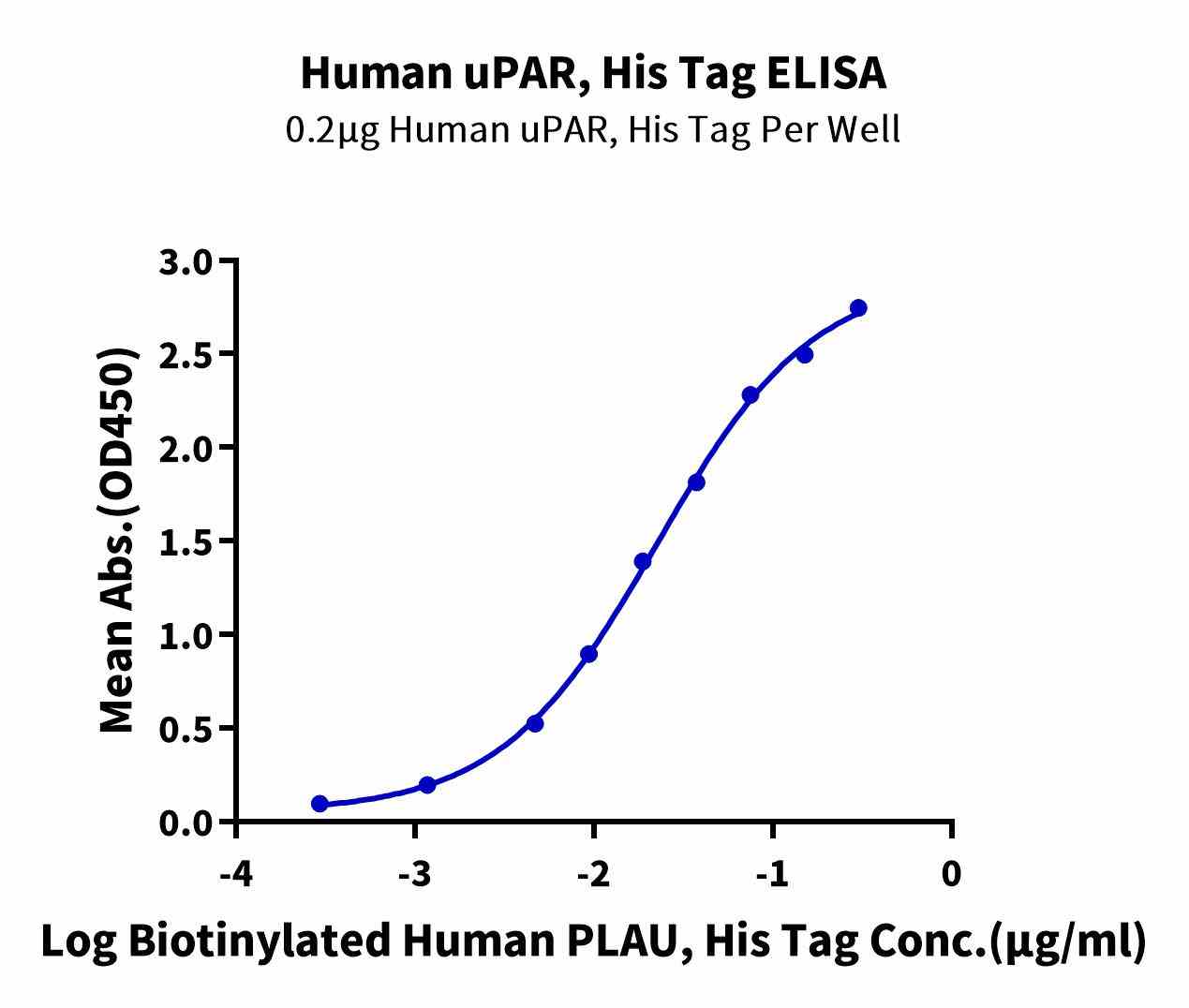 | Bio-activity : | Immobilized Human uPAR, His Tag at 2μg/ml (100μl/well) on the plate. Dose response curve for Biotinylated Human Human PLAU, His Tag with the EC50 of 22.5ng/ml determined by ELISA. |
