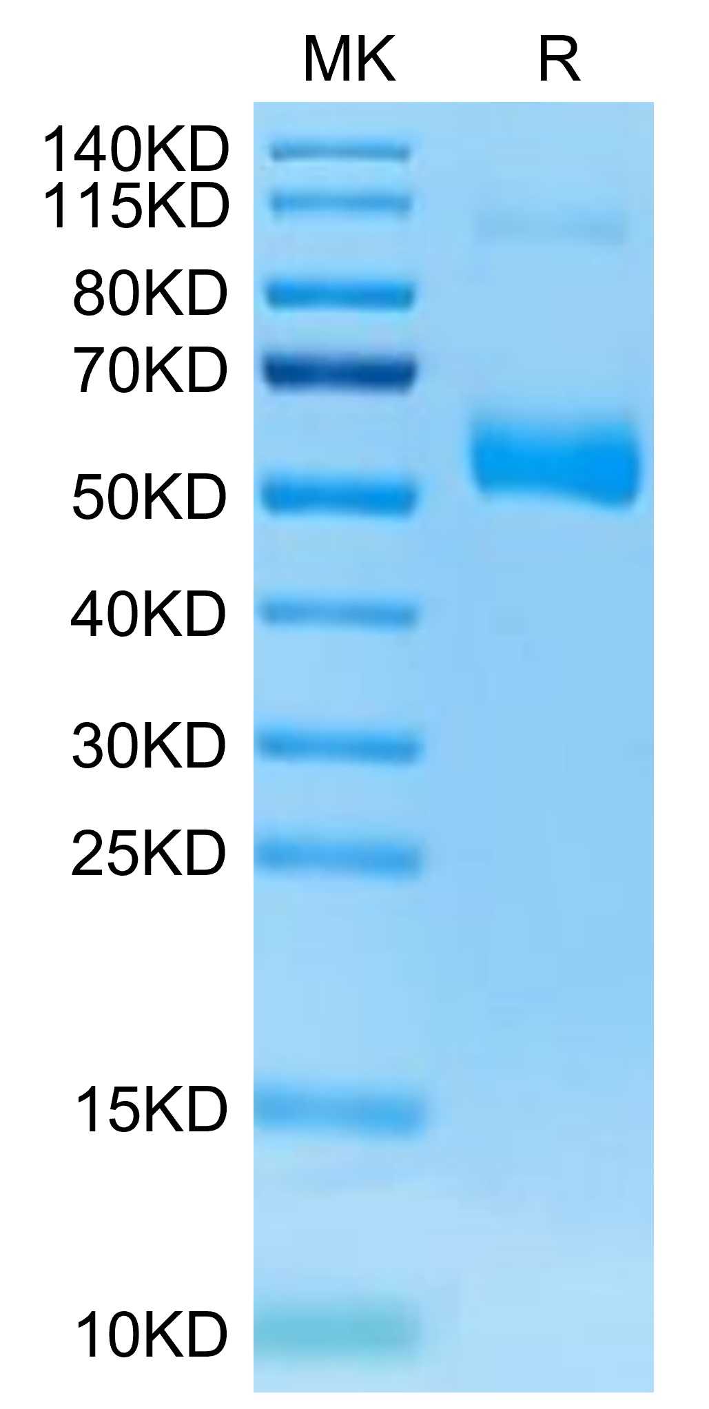 | Molecular Mass : | The protein has a predicted MW of 45.97 kDa. Due to glycosylation, the protein migrates to 50-70 kDa based on Tris-Bis PAGE result. |