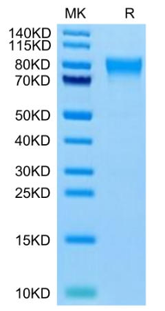 | Molecular Mass : | The protein has a predicted MW of 49.05 kDa. Due to glycosylation, the protein migrates to 75-95 kDa based on Bis-Tris PAGE result. |
