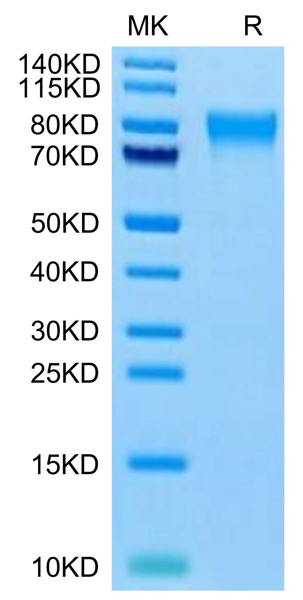 | Molecular Mass : | The protein has a predicted MW of 49.05 kDa. Due to glycosylation, the protein migrates to 75-95 kDa based on Tris-Bis PAGE result. |