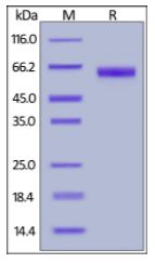 | Molecular Mass : | The protein has a calculated MW of 48.6 kDa. The protein migrates as 60-66 kDa under reducing (R) condition (SDS-PAGE) due to glycosylation. |