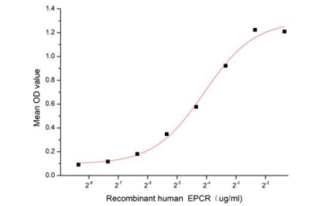 | Bio-activity : | Endothelial protein C receptor (EPCR) also known as CD201, is a transmembrane glycoprotein expressed on vascular endothelial cells and functions as a negative regulator of thrombosis. It is expressed most strongly in the endothelial cells of arteries and veins in heart and lung. Mature human EPCR consists of a 193 amino acid (aa) extracellular domain (ECD), a 21 aa transmembrane segment, and a 7 aa cytoplasmic tail. Within the ECD, human EPCR shares 63% and 66% aa sequence identity with mouse and rat EPCR, respectively. EPCR inhibits thrombosis through its interactions with Protein C, activated Protein C (APC), and Coagulation Factors VII, and VIIa. Thus a functional binding ELISA assay was conducted to detect the interaction of recombinant human EPCR and recombinant rat Coagulation Factor VII (F7). Briefly, EPCR was diluted serially in PBS with 0.01% BSA (pH 7.4). Duplicate samples of 100 μl were then transferred to F7-coated microtiter wells and incubated for 1h at 37°C. Wells were washed with PBST and incubated for 1h with anti-EPCR pAb, then aspirated and washed 3 times. After incubation with HRP labelled secondary antibody for 1h at 37°C, wells were aspirated and washed 5 times. With the addition of substrate solution, wells were incubated 15-25 minutes at 37°C. Finally, add 50 µL stop solution to the wells and read at 450/630nm immediately. The binding activity of recombinant human EPCR and recombinant rat F7 was shown, the EC50 for this effect is 0.06 ug/mL. |