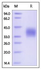 | Molecular Mass : | The protein has a calculated MW of 22.8 kDa. The protein migrates as 33-42 kDa under reducing (R) condition (SDS-PAGE) due to glycosylation. |