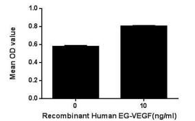 Endothelial gland-derived VEGF (EG-VEGF) is an angiogenic protein that is structurally unrelated to VEGF. It is expressed in steroidogenic tissues such as adrenal gland, ovary, testis, and placenta. Like VEGF it can induce fenestrae in endothelial cells. To test the effect of EG-VEGF on cell proliferation of ECV-304 endothelium cell line, cells were seeded into triplicate wells of 96-well plates at a density of 5,000 cells/well and allowed to attach overnight, then the medium was replaced with serum-free standard DMEM prior to the addition of various concentrations of EG-VEGF. After incubated for 72h, cells were observed by inverted microscope and cell proliferation was measured by Cell Counting Kit-8 (CCK-8). Briefly, 10µL of CCK-8 solution was added to each well of the plate, then measure the absorbance at 450nm using a microplate reader after incubating the plate for 1-4 hours at 37°C. |