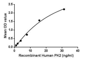 | Bio-activity : | Prokineticin 2 (PK2) is a secreted protein belonging to the prokineticins family. It thought to be involved in several important physiological processes like neurogenesis, tissue development, angiogenesis, and nociception. Otherimportant physiological roles the Bv8/Prokineticins (PKs) are involvedinmayinclude cancer, reproduction, and regulating physiological functions that influencecircadian rhythms like hormone secretion, ingestive behaviors, and the sleep/wakecycle. Besides, Prokineticin receptor 1(PKR1) has been identified as aninteractor of PK2, thus a binding ELISA assay was conducted to detect the interaction of recombinant human PK2 and recombinant human PKR1. Briefly, PK2 were diluted serially in PBS, with 0.01% BSA (pH 7.4). Duplicate samples of 100uL were then transferred to PKR1-coated microtiter wells and incubated for 2h at 37°C. Wellswere washed with PBST and incubated for 1h with anti-PK2 pAb, then aspirated and washed 3 times. After incubation with HRP labelled secondary antibody, wells were aspirated and washed 3 times. With the addition of substrate solution, wells were incubated 15-25 minutes at 37°C. Finally, add 50µL stop solution to the wells and read at 450nm immediately. The binding activity of PK2 and PKR1 was shown, and this effect was in a dose dependent manner. |