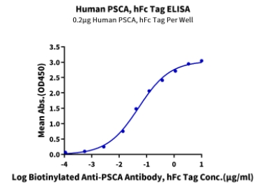 | Bio-activity : | Immobilized Human PSCA, hFc Tag at 2ug/ml (100ul/Well) on the plate. Dose response curve for Biotinylated Anti-PSCA Antibody, hFc Tag with the EC50 of 50.8ng/ml determined by ELISA. |