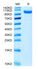 Molecular Mass : | The protein has a predicted MW of 75.7 kDa. Due to glycosylation, the protein migrates to 80-115 kDa based on Tris-Bis PAGE result. |