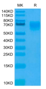 Molecular Mass : | The protein has a predicted MW of 38 kDa. Due to glycosylation, the protein migrates to 55-70 kDa based on Tris-Bis PAGE result. |