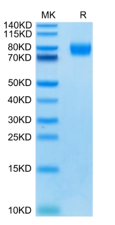 | Molecular Mass : | The protein has a predicted MW of 61.8 kDa. Due to glycosylation, the protein migrates to 75-100 kDa based on Tris-Bis PAGE result. |