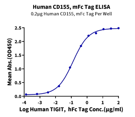 | Bio-activity : | Immobilized Human CD155, mFc Tag at 2μg/ml (100μl/well) on the plate. Dose response curve for Human TIGIT, hFc Tag with the EC50 of 0.13μg/ml determined by ELISA. |
