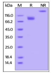 | Molecular Mass : | The protein has a calculated MW of 62.2 kDa. As a result of glycosylation, the protein migrates as 70-100 kDa under reducing (R) condition, and 130-160 kDa under non-reducing (NR) condition (SDS-PAGE). |