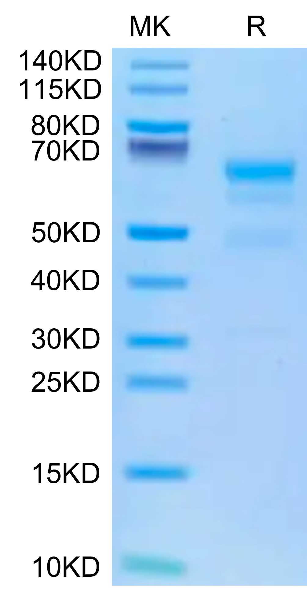 Molecular Mass : | The protein has a predicted MW of 49.12 kDa. Due to glycosylation, the protein migrates to 60-70 kDa based on Tris-Bis PAGE result. |