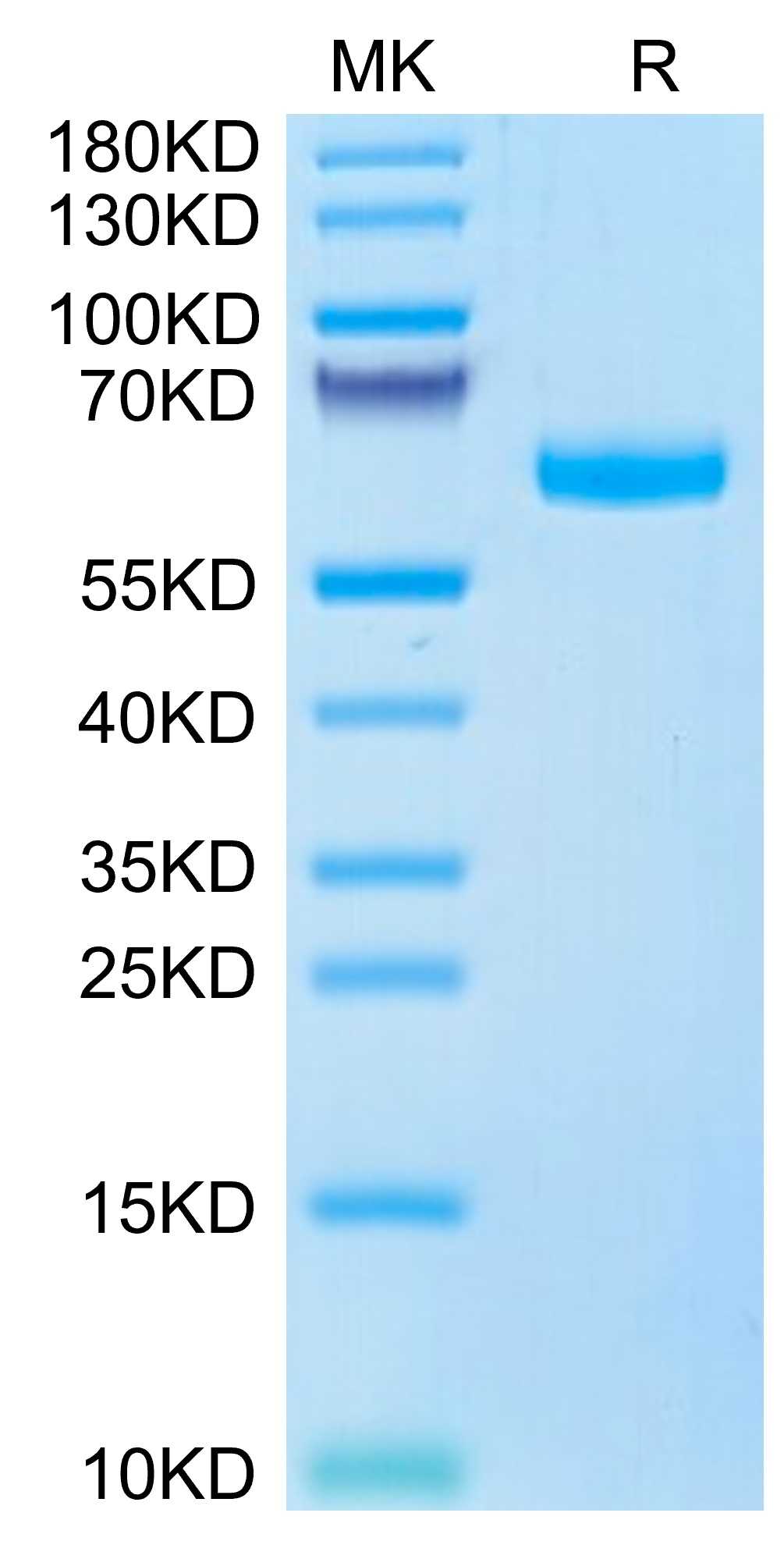 Molecular Mass : | The protein has a predicted MW of 48.61 kDa. Due to glycosylation, the protein migrates to 55-70 kDa based on Tris-Bis PAGE result. |