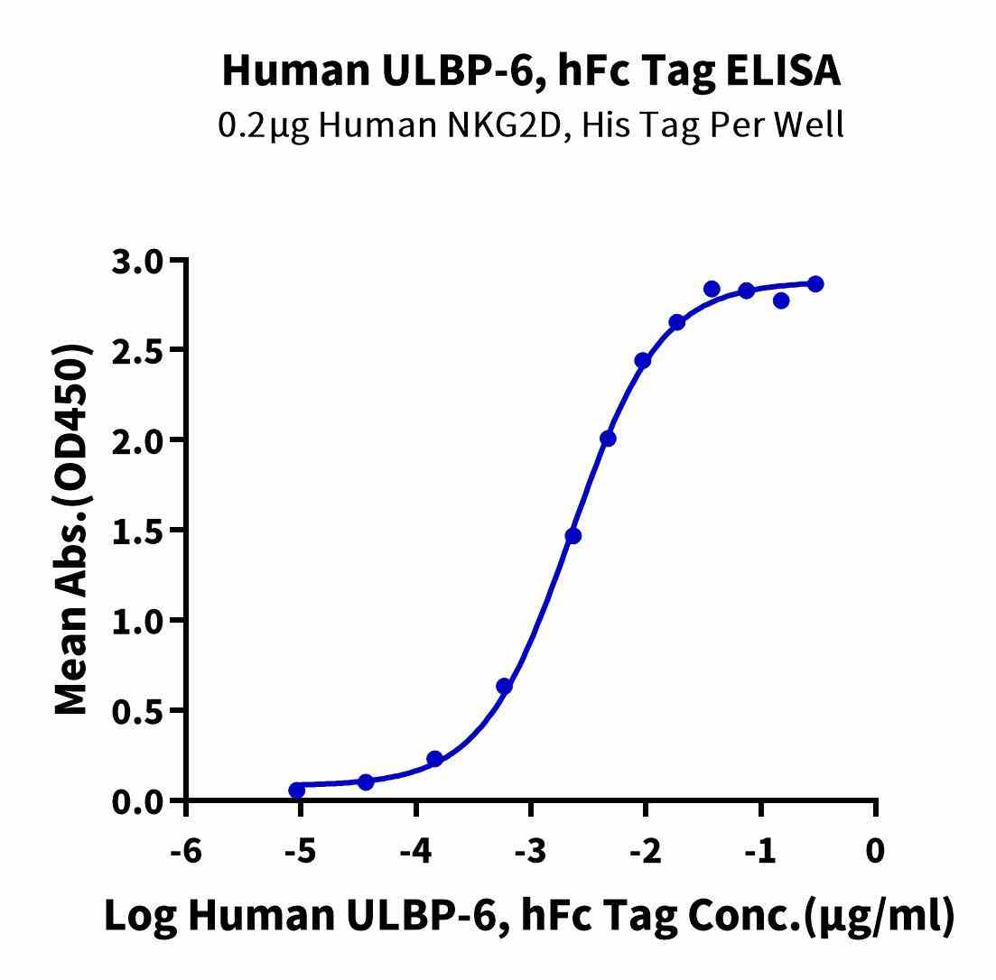 | Bio-activity : | Immobilized Human NKG2D, His Tag at 2μg/ml (100μl/well) on the plate. Dose response curve for Human ULBP-6, hFc Tag with the EC50 of 5.7ng/ml determined by ELISA. |