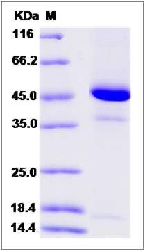 | Molecular Mass : | The recombinant human REG4/Fc is a disulfide-linked homodimer. The reduced monomer comprises 396 amino acids and has a predicted molecular mass of 44.3 kDa. The apparent molecular mass of the protein is approximately 45 kDa in SDS-PAGE under reducing cond |