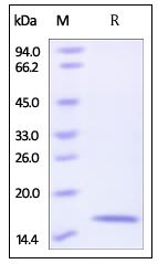 | Molecular Mass : | The protein has a calculated MW of 16.7 kDa. The protein migrates as 18 kDa under reducing (R) condition (SDS-PAGE) due to glycosylation. |