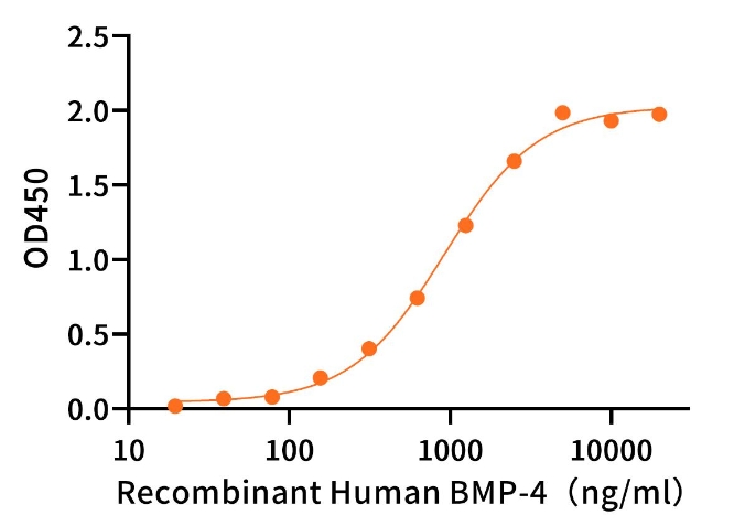 | Bio-activity : | Immobilized Recombinant Human RGMB (C-6His) at 10 μg/ml (100 μl/well) can bind Recombinant Human BMP-4: Biotinylated by NHS-biotin prior to testing. The ED50 of Recombinant Human BMP-4 is 0.92 μg/ml. |